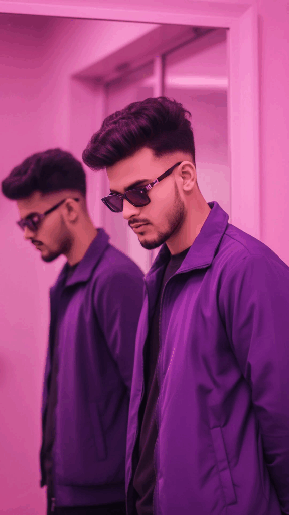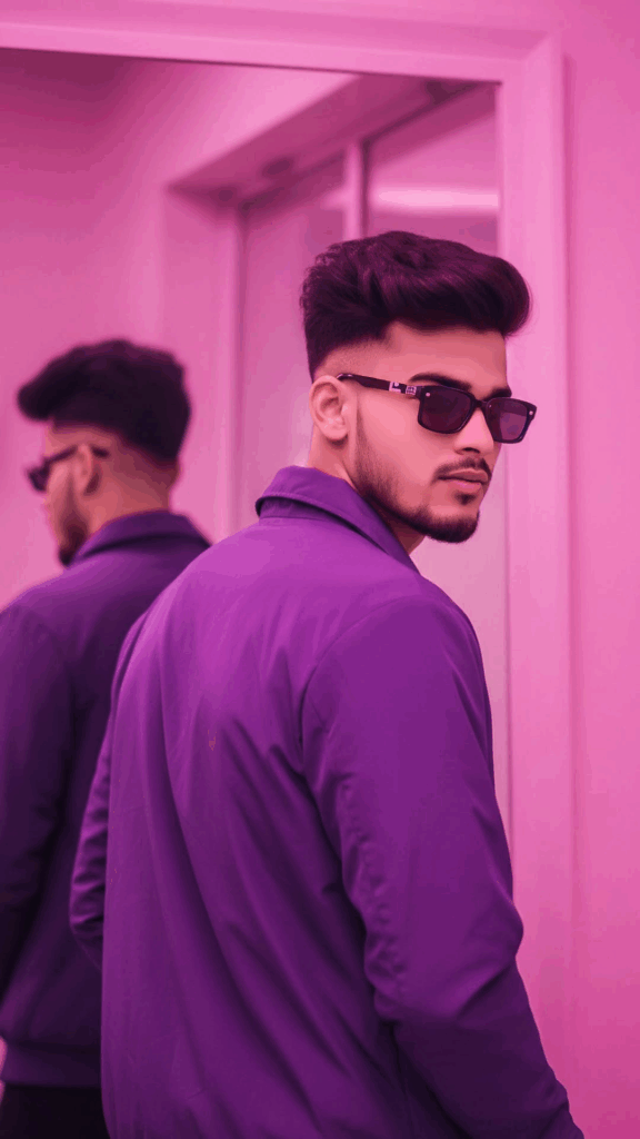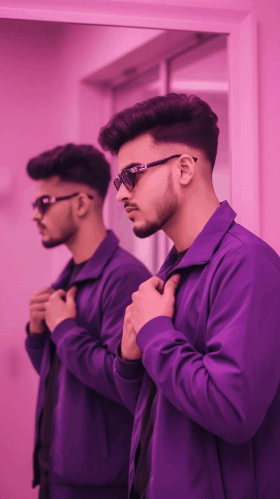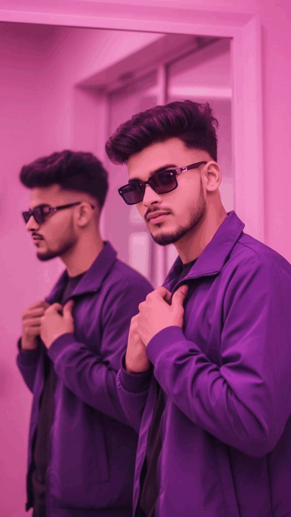 The mirror doesn’t just reflect your face — it reflects your confidence and attitude. This Purple Mirror Look is all about mixing mood lighting, minimal setup, and confident poses to create a cinematic and aesthetic vibe. Perfect for AI photo prompts, Reels, or professional indoor photoshoots.