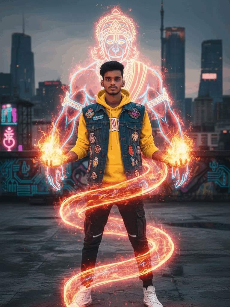 “young man wearing a hoodie layered with a denim vest covered in patches, joggers, white high-top sneakers. He stands in an urban rooftop with graffiti walls. His hands ignite with glowing fire, and a fiery neon mystic Loud hanuman ji spirals around him. Loud hanuman ji is holographic, luminous red-orange with electric blue highlights. Cinematic urban fantasy aesthetic, VFX, cyberpunk atmosphere.”