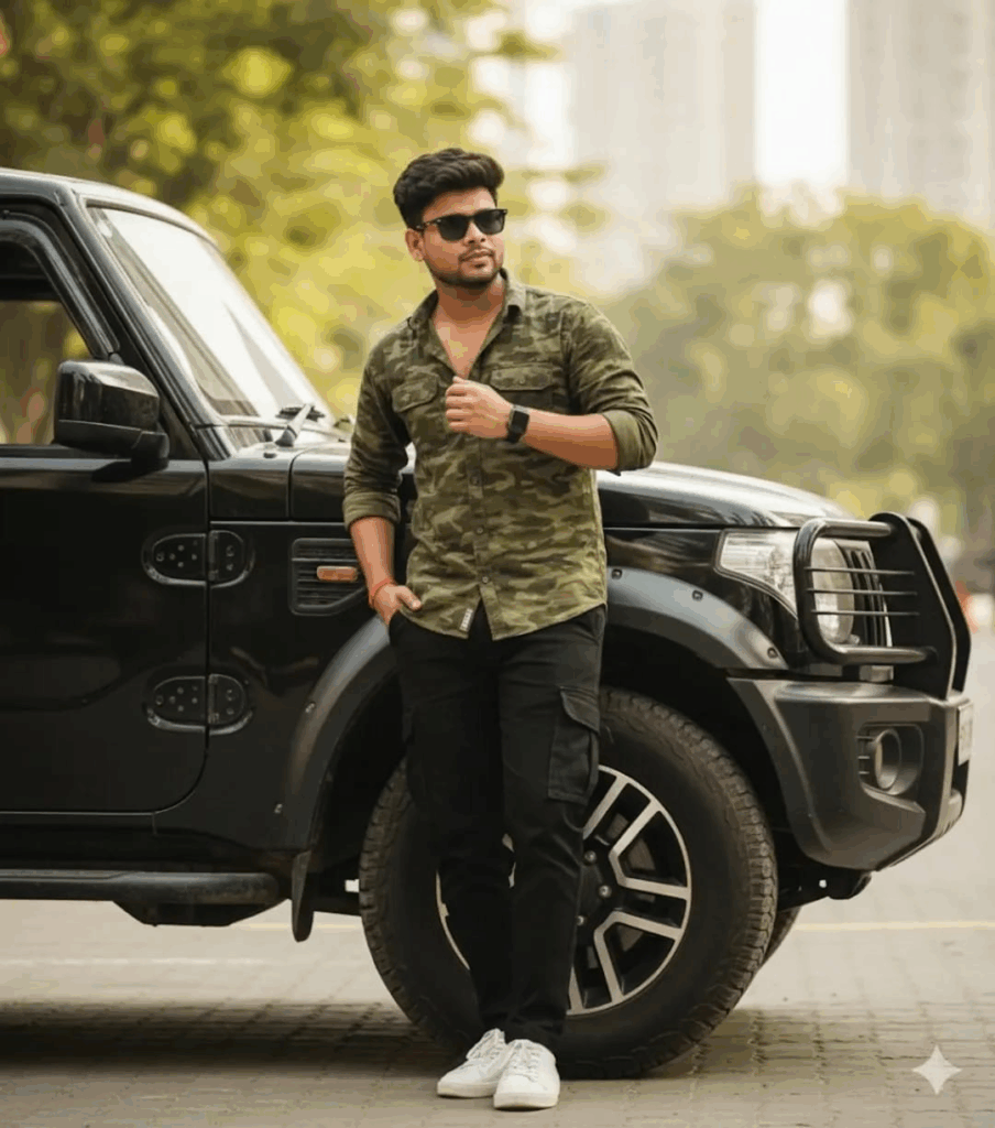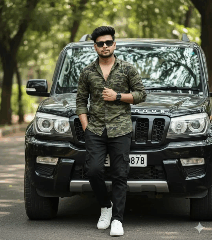 The first image captures a stylish man leaning on a black SUV, dressed in a camouflage green shirt, black jeans, and white sneakers. His pose reflects natural charm and confidence — the kind of shot that fits lifestyle blogs or influencer portfolios.